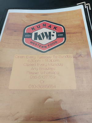 Hari Selasa, Abang Imi ajak makan chicken chop di Kunak Western Food. Ok je janji ibu tak perlu drive. Ibu pun tak confident lah jalan ke sana jadi guna waze je. Waze tu nak senang je lah, dibawanya ikut DASH. Ok jugalah sebab petang tu orang balik kerja jadi jimatlah masa tak perlu lalu kesesakan jalan raya. Bila nak sampai, kami pun rasa pelik kenapa jalan yang diberi lain sangat. Kena lalu rumah orang. Dahlah masuk Kampung Melayu Subang yang banyak rumah-rumah. Bila nak sampai tu memang kena masuk lorong ke dalam. ahhh... sudah... ibu call Kawi betul tak nama kedai tu Kunak. Kawi kata gerai tu dah pindah. So betullah tempat yang kami nak tuju tu.